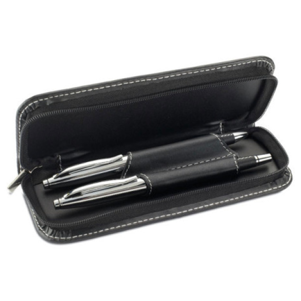 BALTIMORE, Набір з ручки ролера та кулькової ручки у чохлі зі штучної шкіри на блискавці з контрастною стрічкою з лого
