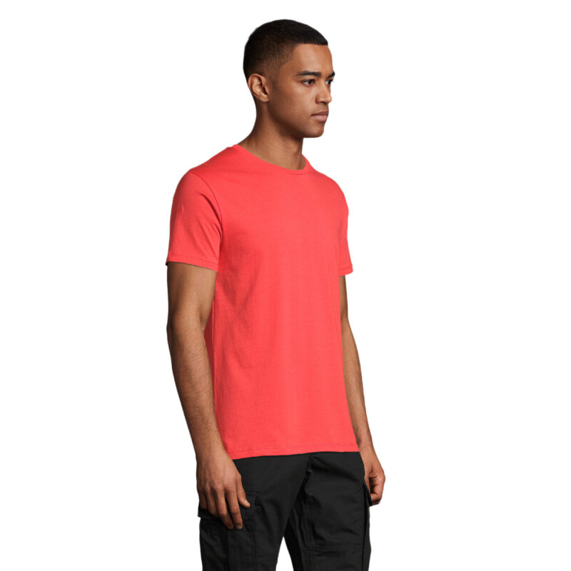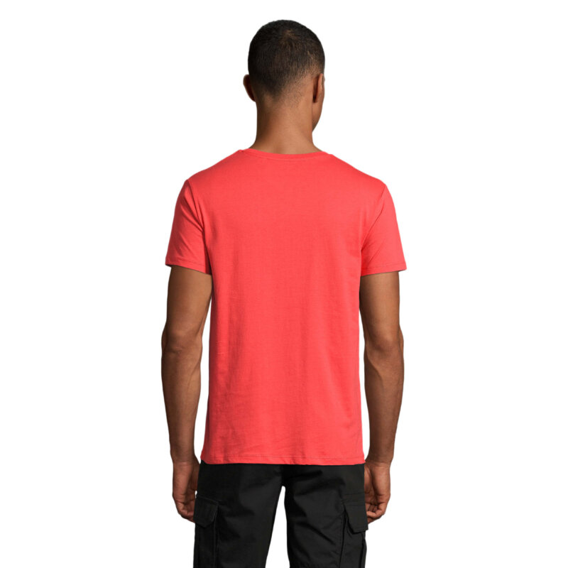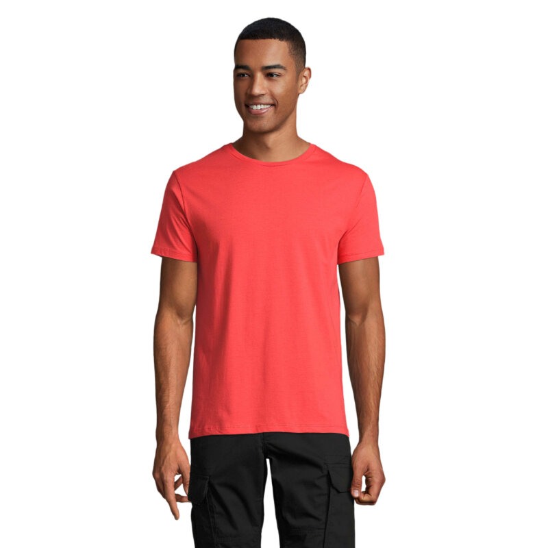 Чоловіча облягаюча футболка з круглою горловиною. Оброблено спеціальними ензимами для додання особливої м’якості виробу – комір в тонку резинку.