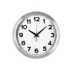 Настінний годинник з металевим обідком сріблястого кольору з чорнобілим циферблатом.