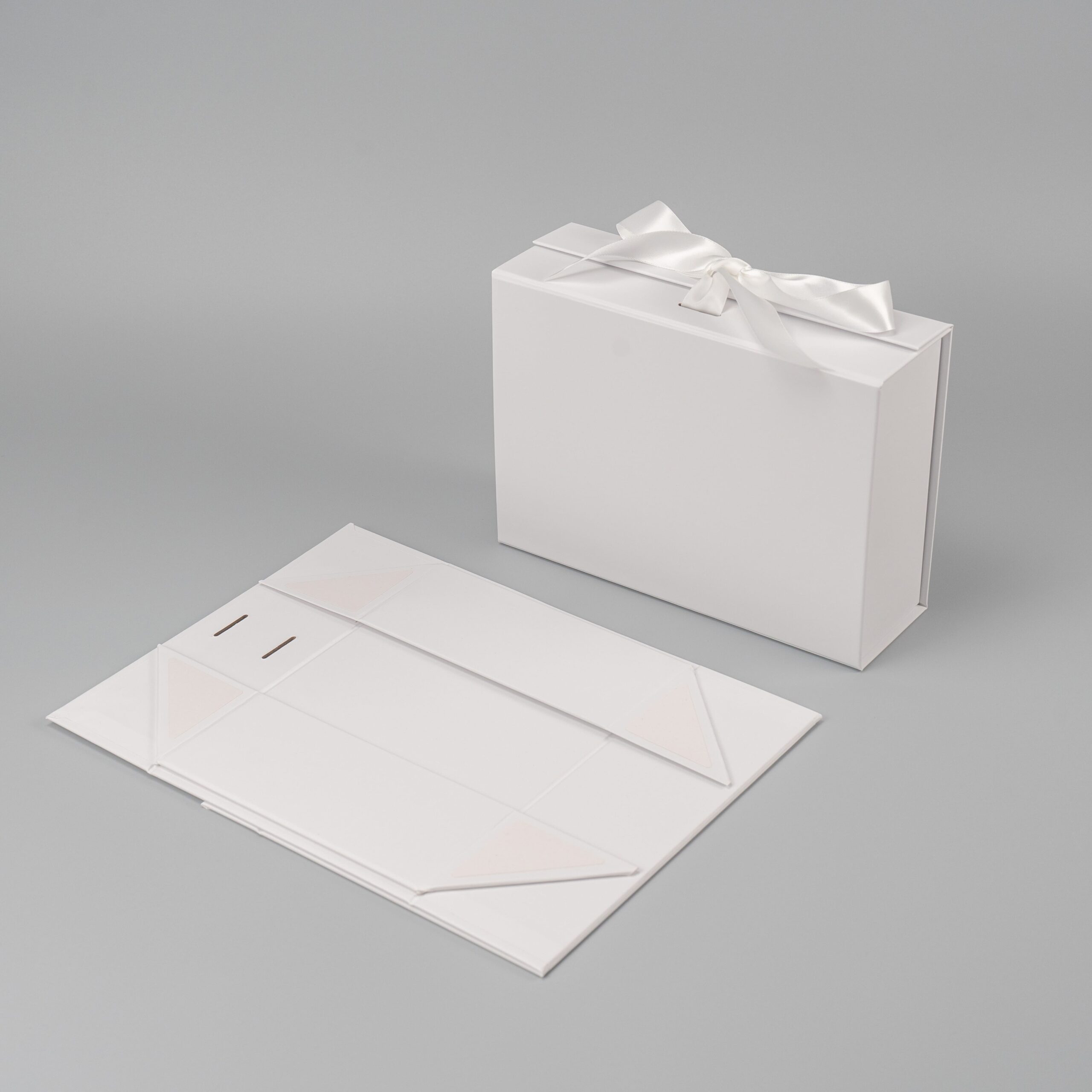 Коробка складна з твердого, переплетеного картону, вкрита дизайнерським папером, атласна лента ширина 2,5 см. Кришка на магнітах.