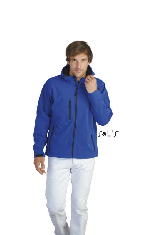 Чоловіча куртка з капюшоном софтшелл SOL’S REPLAY MEN. Кишені на блискавці з боків і на грудях, стягуючий шнур на талії, регульовані за допомогою липучок манжети; капюшон зі стягуючим шнуром. Блискавки SBS.
