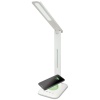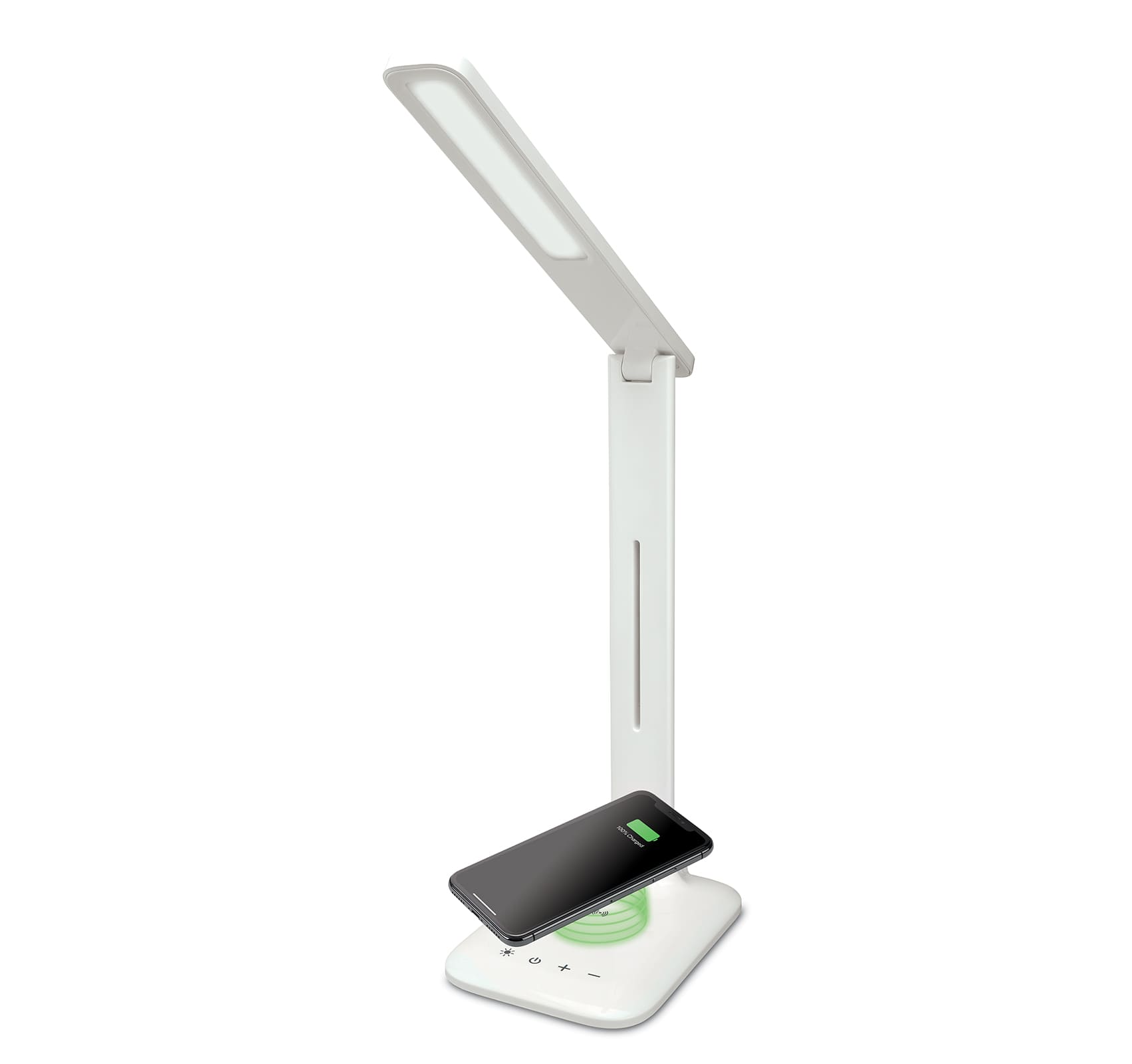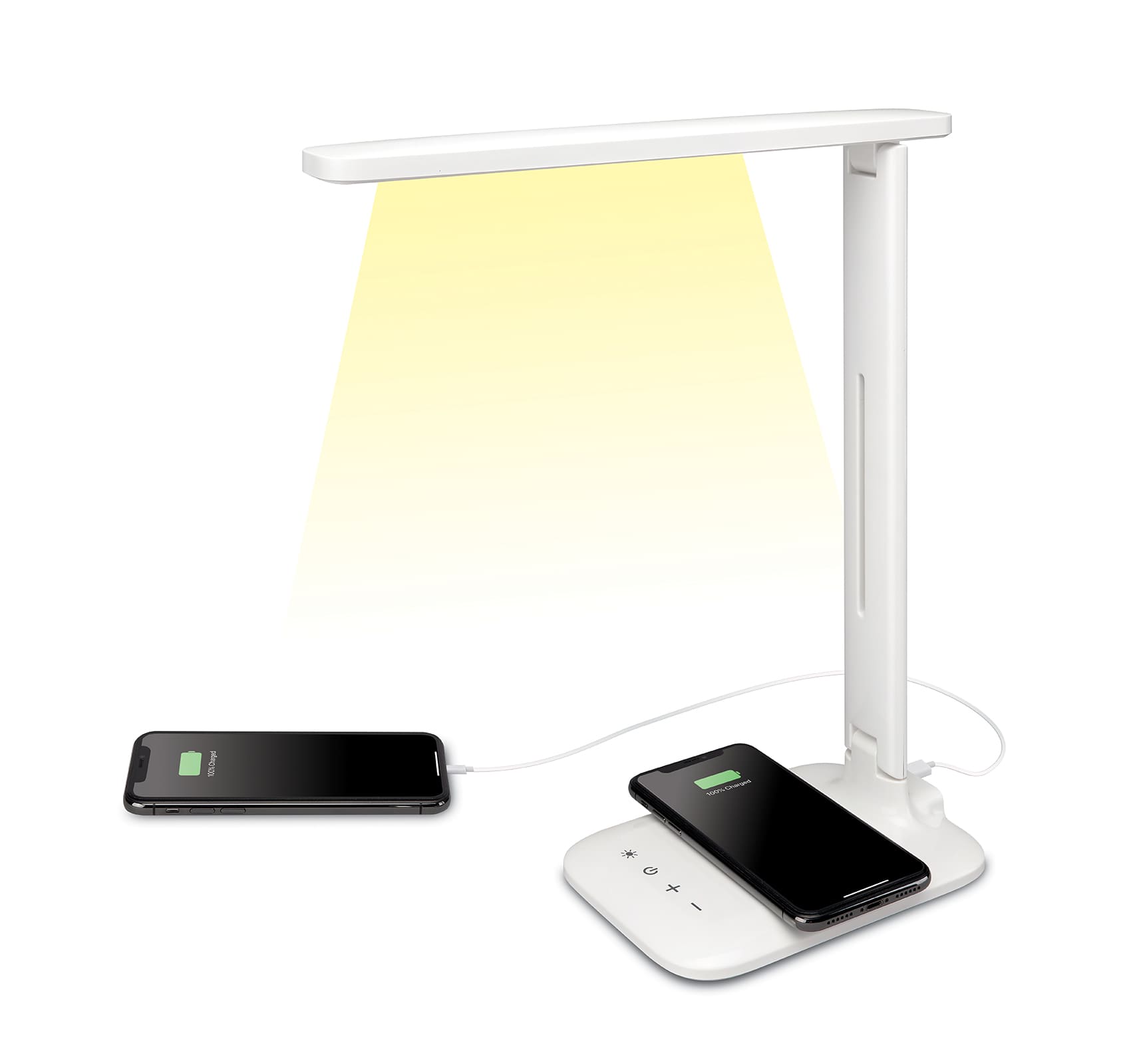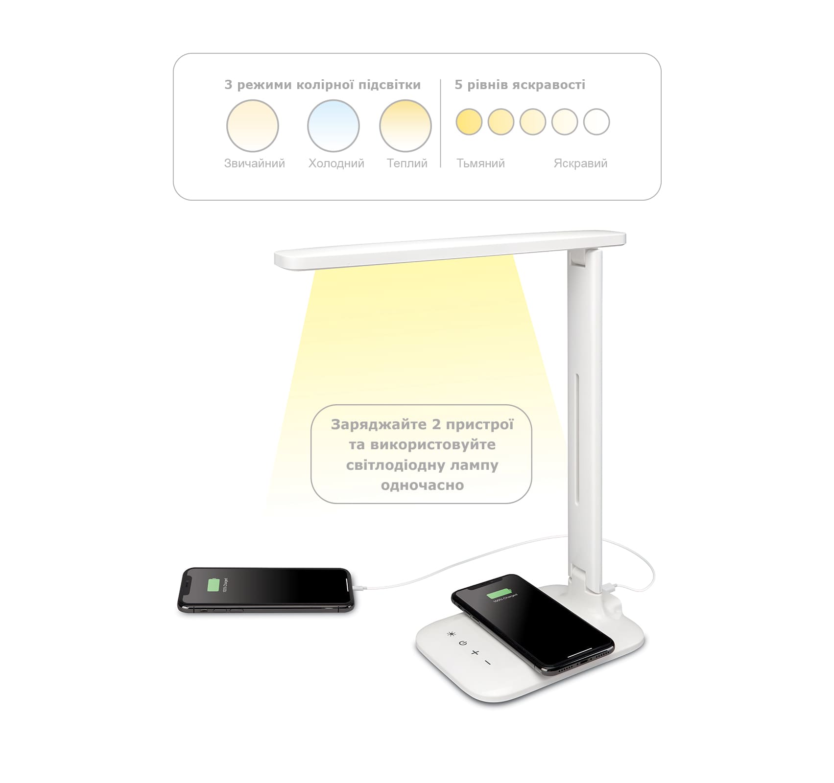 Розумна функціональна настільна лампа з 3 режимами освітлення: теплий жовтий, нейтральний та холодний. На панелі основи лампи можна також регулювати яскравість освітлення. В лампі передбачена бездротова зарядка 10W для зарядки смартфонів, а також порт USB для дротової зарядки пристроїв 5V/1A Max. Завдяки продуманій конструкції лампа може приймати практично любі положення. В комплекті блок живлення 220 В та інструкція. Розмір виробу 16,8 х 12 х 33 см, Вага 450 г, Матеріал: ABS+PS.Нанесення : тамподрук , Уф-друк.