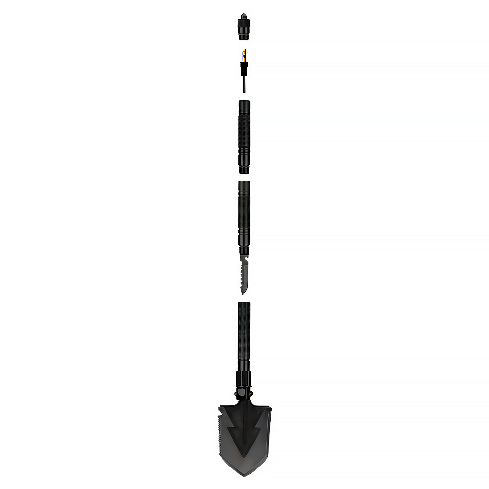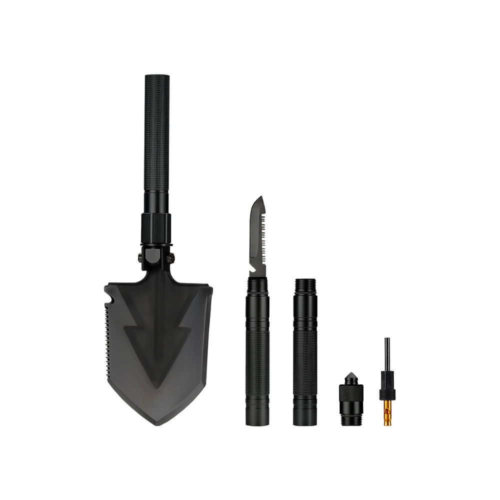 Багатофункціональна лопата для застосування у туризмі. Включає 15 функцій, у тому числі ніж, свисток, викрутка, склобій. Виготовлена з міцних та зносостійких матеріалів, нержавіюча сталь 20cr13 і високоміцний алюміній 6061-T6,зручної конструкції, легко упаковувати, зберігати та переносити. Витримує значні механічні навантаження. Довжина лопати складає 1 метр.