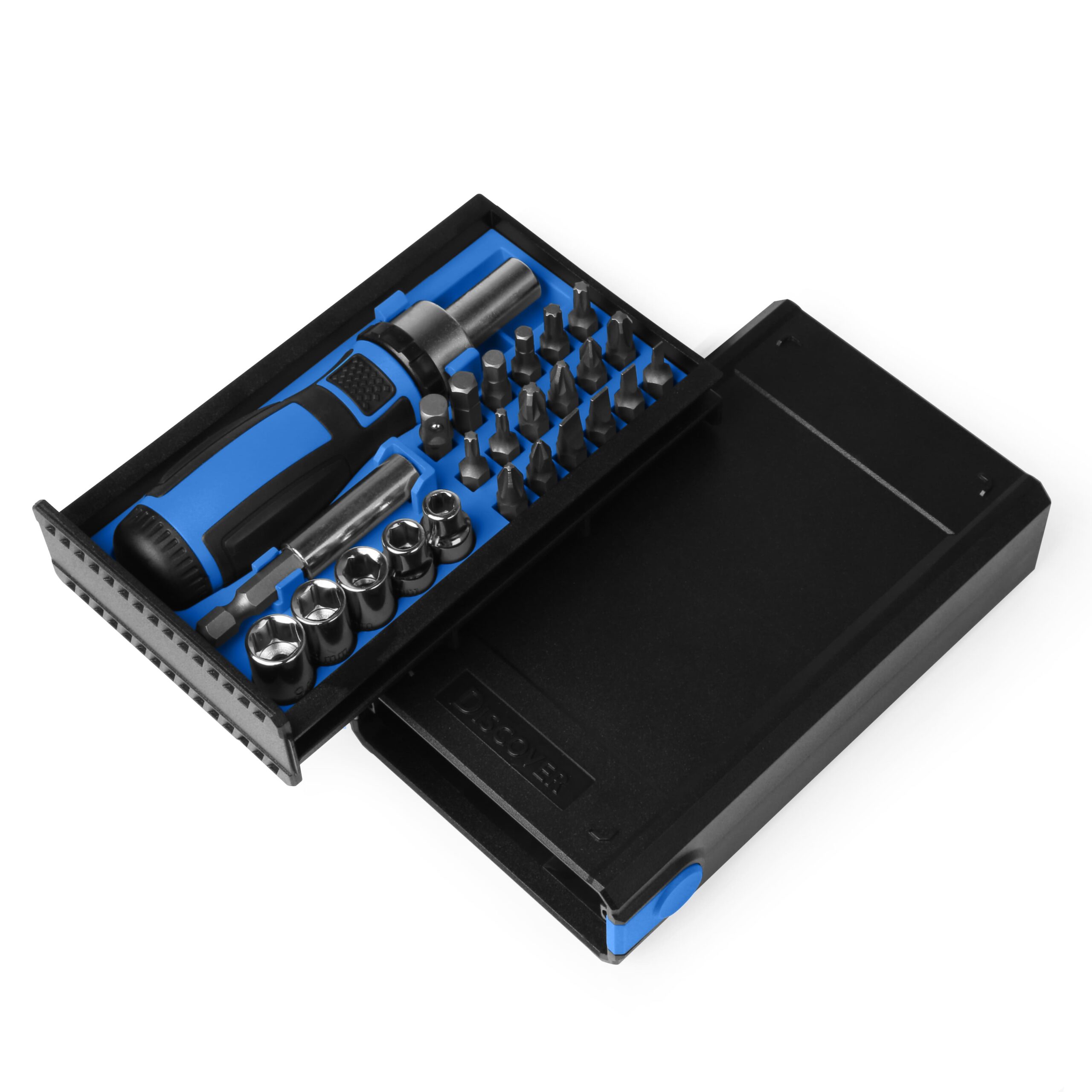 Набір з високоякісної сталі в компактній, пластиковій коробці, яка оригінально відкривається натиском на кнопку. В комплект входить 37 шт інструментів: