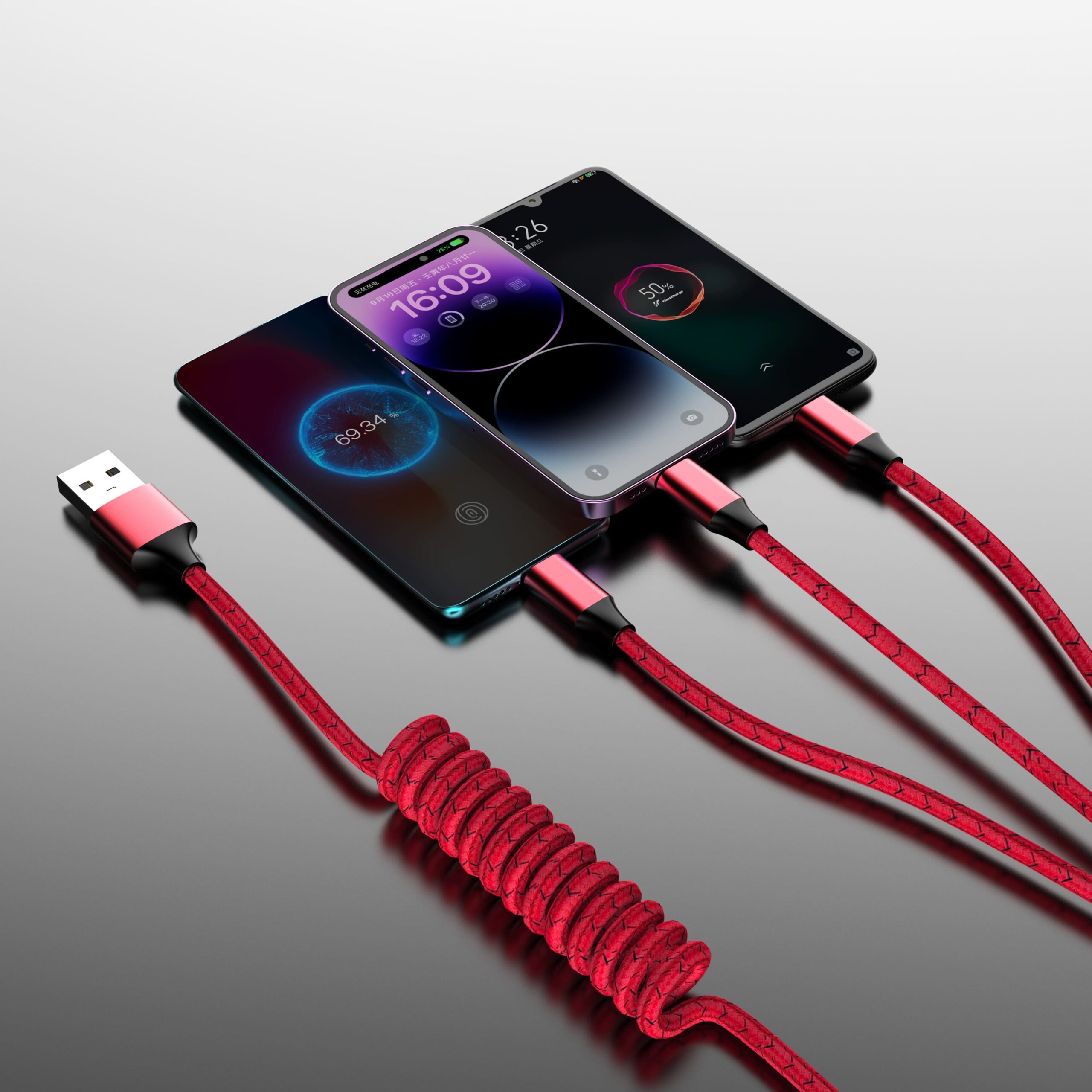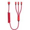 Універсальний кабель 3-в-1 для зарядки гаджетів, довжина в розтягнутому стані 1,2 м. Має стандартний USB вхід для підключення живлення та три різні виходи Lightning + Mscro USB + Type-C.
