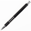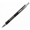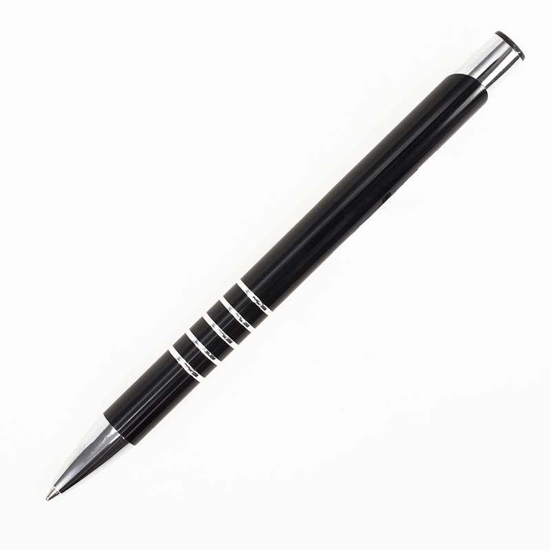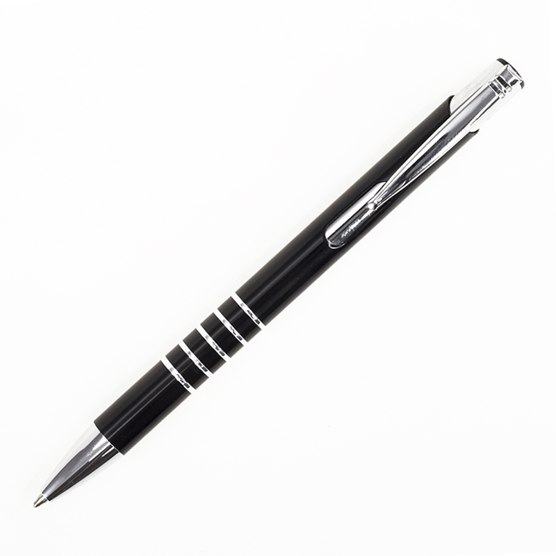 Металева анодирувана алюмінієва ручка, кнопковий механізм, металевий хромований кліп-кнопка, 5 кілець на зоні захоплення, хромований носик, колір гравіювання – срібло. 136 мм.