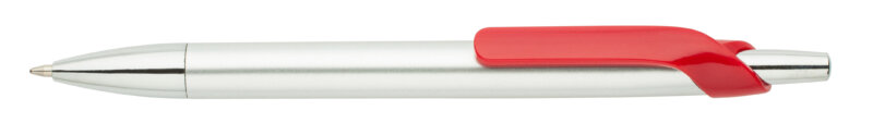 Кулькова ручка з матового пластика кольору «Алюміній» доповнена носиком і кнопкою кольору глянсове срібло. З яскравим кольоровим пластиковим кліпом.
