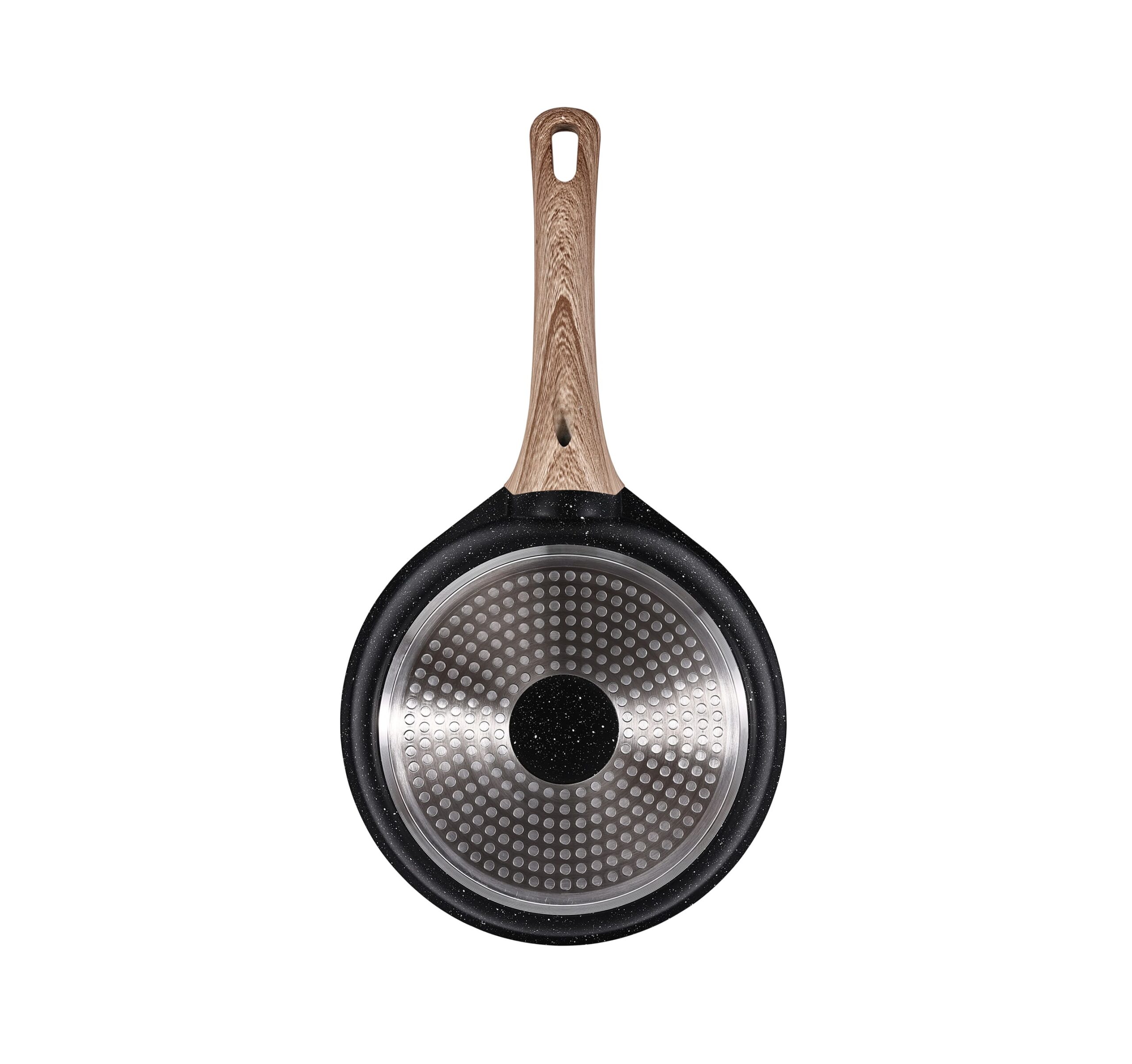 Сковорода виготовлена з литого алюмінію з антипригарним покриттям з керамічним вкрапленням. Корпус сковороди забезпечує рівномірний розподіл і тривале збереження тепла, що дозволяє готувати страви будь-якої складності. Ручка виготовлена з бакеліту із покриттям Soft Touch, що забезпечує максимальний комфорт при використанні. Підходить для всіх видів плит, включаючи індукційні. Ручка на сковорідці дуже добре підходить під лазерне гравіювання логотипу.