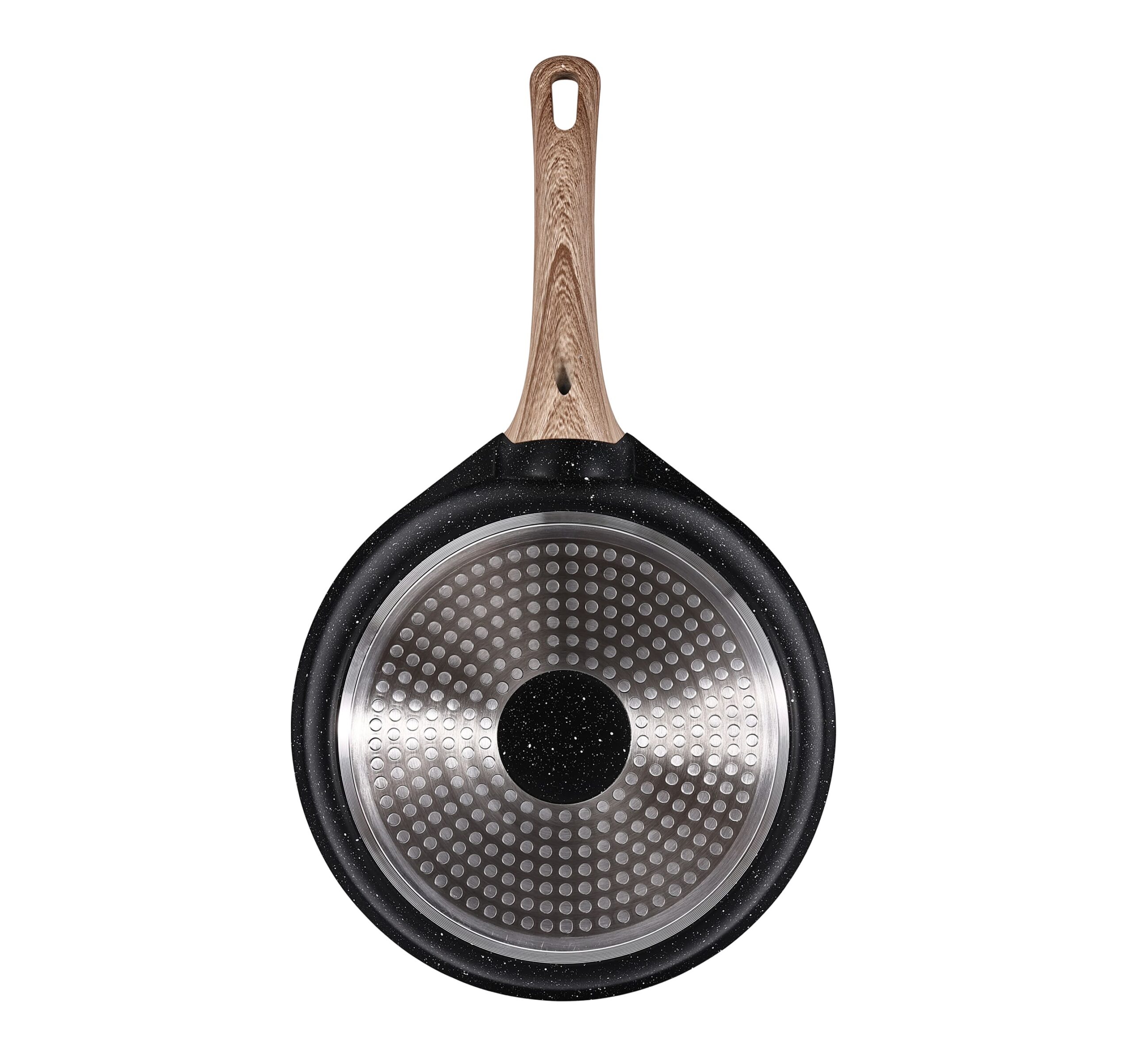 Сковорода виготовлена з литого алюмінію з антипригарним покриттям з керамічним вкрапленням. Корпус сковороди забезпечує рівномірний розподіл і тривале збереження тепла, що дозволяє готувати страви будь-якої складності. Ручка виготовлена з бакеліту із покриттям Soft Touch, що забезпечує максимальний комфорт при використанні. Підходить для всіх видів плит, включаючи індукційні. Ручка на сковорідці дуже добре підходить під лазерне гравіювання логотипу.