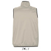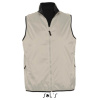Двосторонній водовідштовхувальний і вітрозахисний жилет унісекс. Комір з підкладкою з флісу. Косі бейки з світло-сірого джерсі поліестеру на комірі, проймах і по низу виробу. Дві бічних окантованих кишені на нейлоновій блискавці, двосторонній замок, блискавки з ухватками з тканини в тон підкладки.